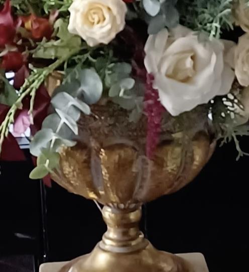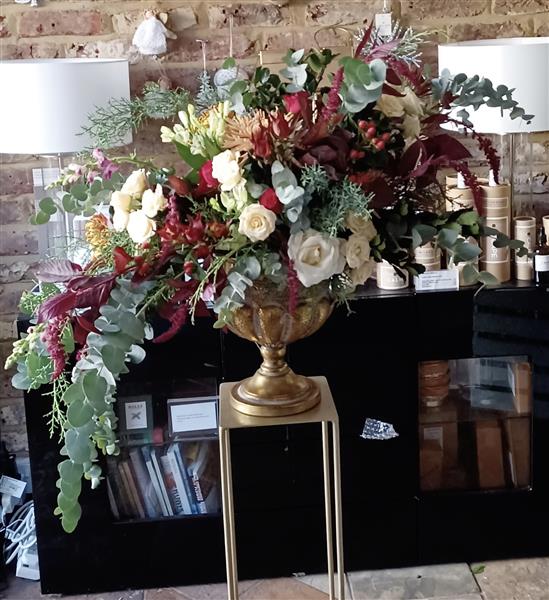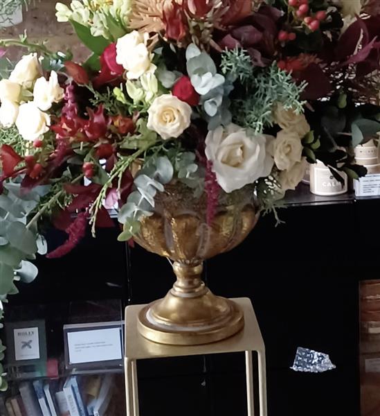 A large luxury asymmetrical floral arrangement, full of seasonal flowers, including the large gold coloured vessel.