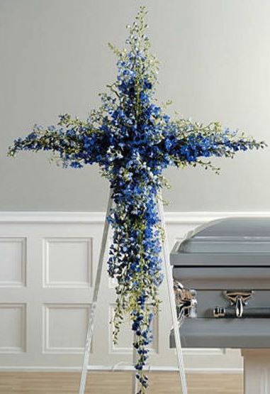 Delphinium Cross floral tribute featuring delphiniums and moss.