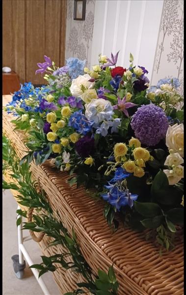 Dephinium and hydrangea casket spray with optional foliage garland