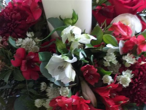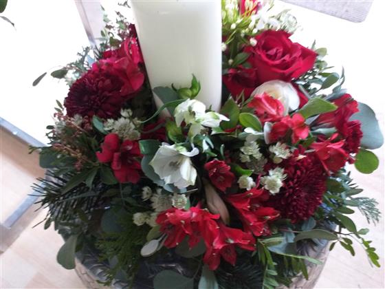 Festive Candle Ring or Table Centre comprising Red roses, White spray roses, Alstroemerias and foliage.