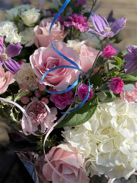 Our Rose Quartz bouquet features hydrangea, roses, spray roses, campanula, clematis, dianthus and foliage
