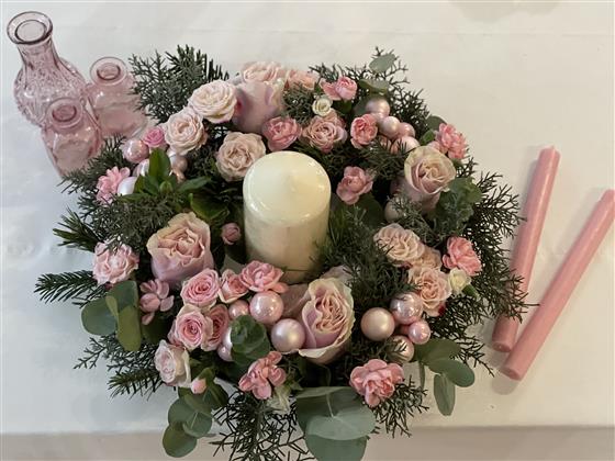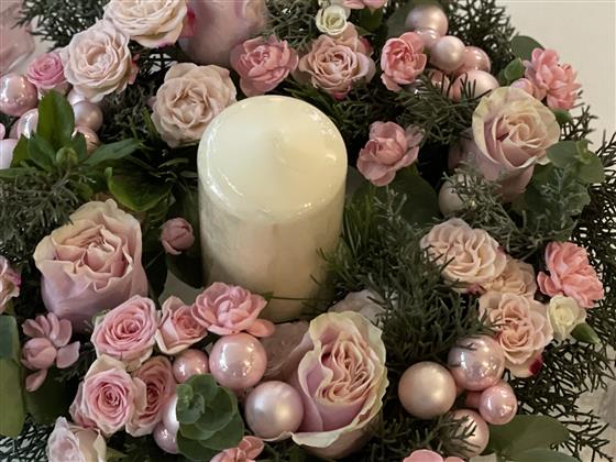 Our pretty pink Sleeping Beauty door wreath or table centre contains roses, spray roses, baubles and seasonal foliage.