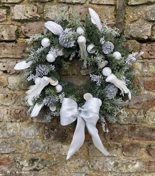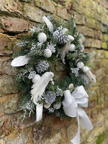 fresh frosted pine with silver feathers, pine cones and pepper berries, snowy birds and snow balls