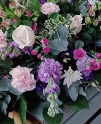 Summer Love Double Ended Casket Spray comprises roses, clematis and seasonal flowers