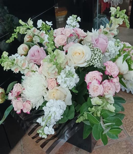 Our bountiful Ascot boxed bouquet features peonies, roses and spray roses as well as other seasonal blooms!