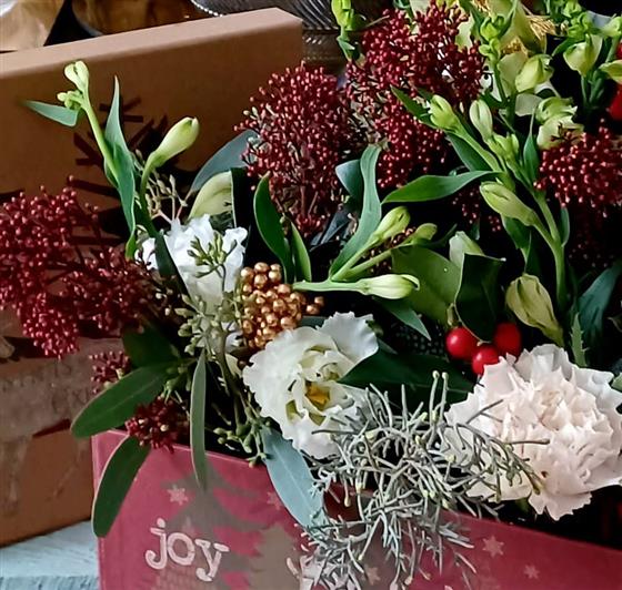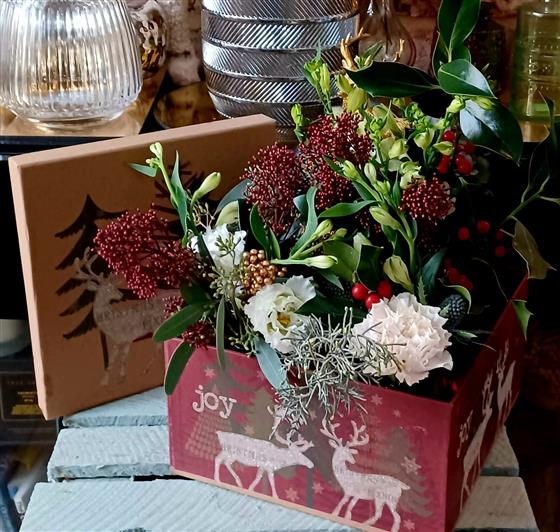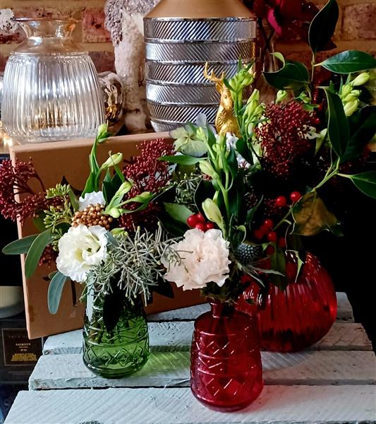 Three vases - one medium and two small containing festive flowers and presented in a decorated box.