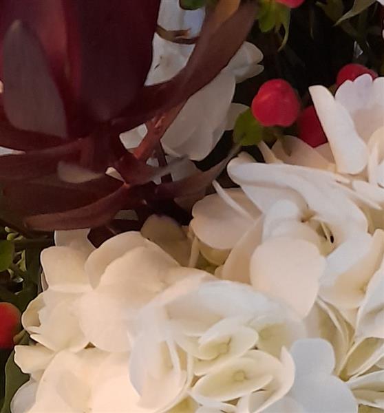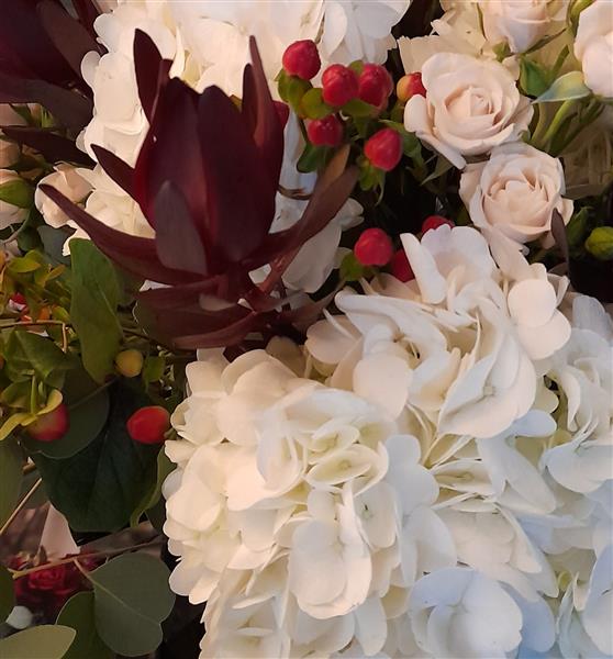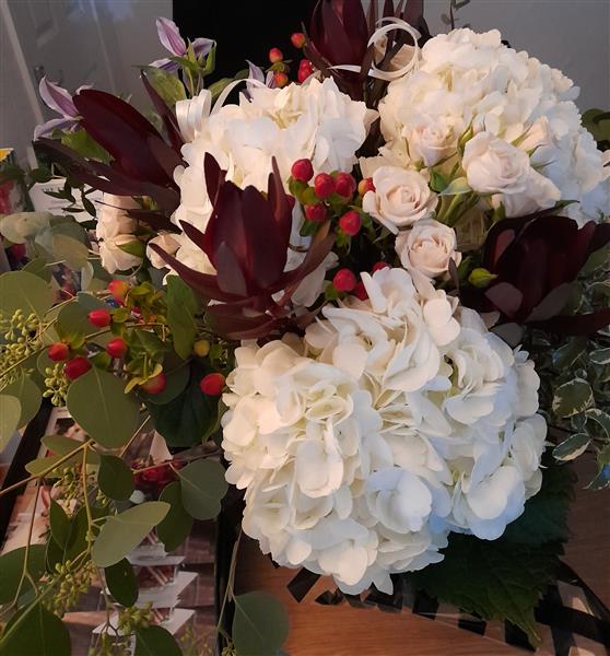 This hydrangea bouquet makes a lovely gift. Featuring hydrangea, spray roses, clematis, hypericum, leucadendron and winter foliage.